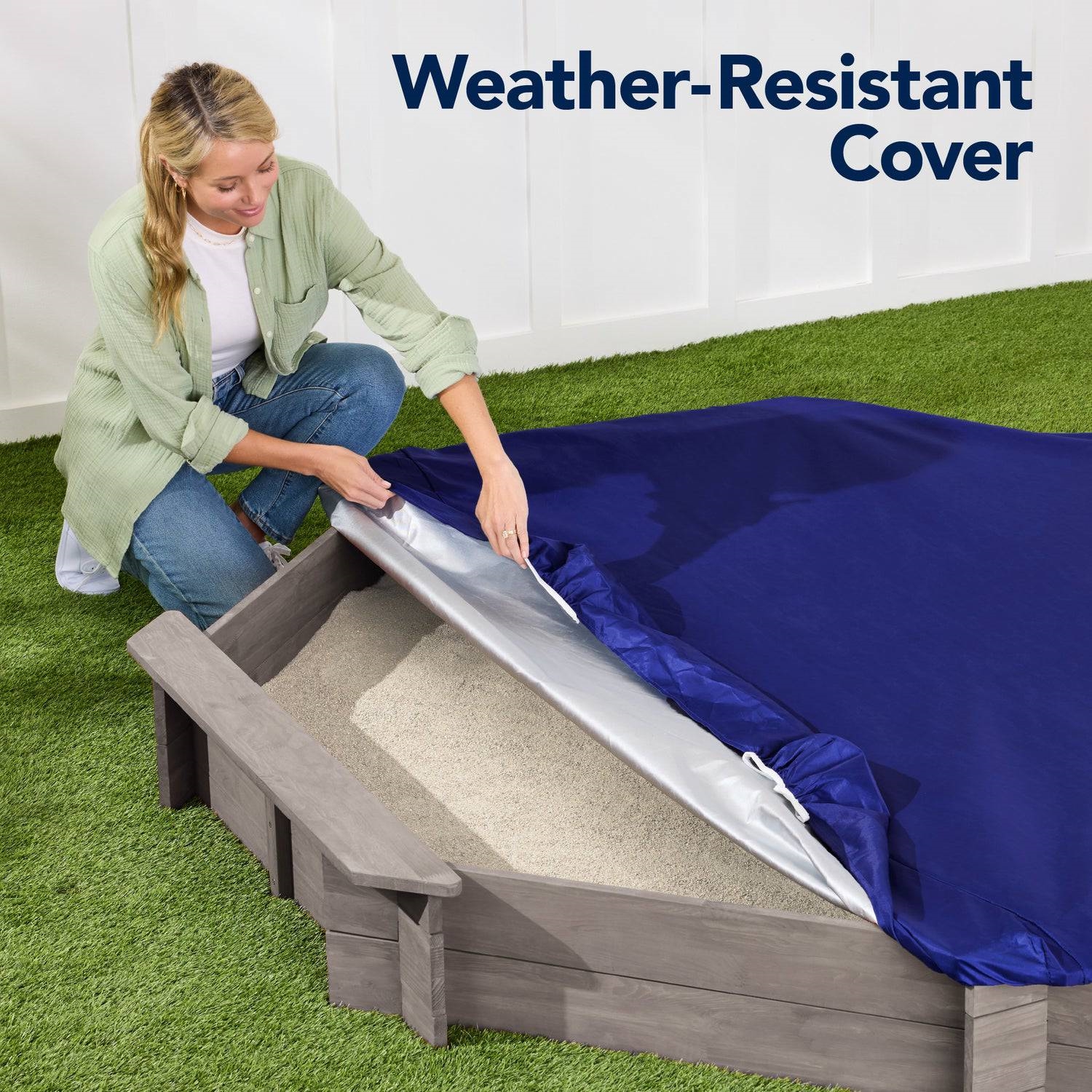 Schools officially out for summer! A uniquely shaped, spacious sandbox provides the perfect venue for children of all ages to meet, play, and explore their imaginations! Each bench comfortably supports up to 220 pounds so parents and children alike can enjoy an afternoon in the sun and sand! Keep your children's play space clear of debris and moisture with a UV- and water-resistant cover An included liner goes under the frame to facilitate drainage and ventilation while discouraging invasive weeds in your child's play space. NOTE: Play-grade sand is sold separately Durable, heat-treated hemlock wood panels are interlocked at the joints for a sturdy assembly that retains its shape and withstands the elements over time