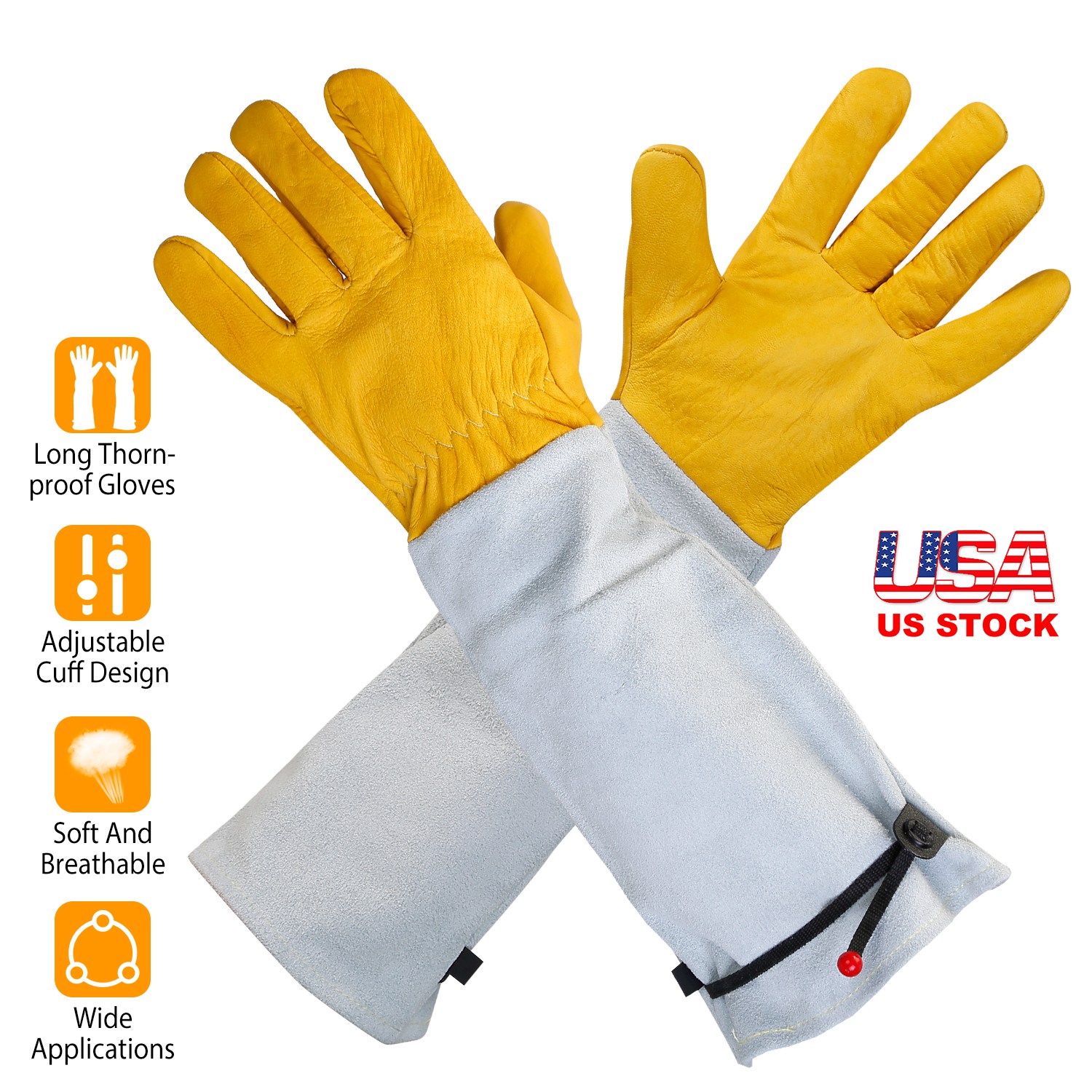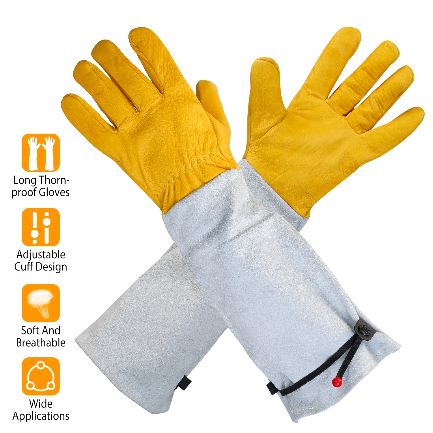 Whether you’re weeding, pruning, or harvesting the first tomatoes of the season, your hands are in need of some protection from dirt, thorns, and blisters-that’s just what our gardening gloves offer. This pair gloves with long cuffs protect your arms against thorns and branches while the premium leather material provide manual dexterity and comfort required for gardening chores. An ideal helper for you to deal with the gardening work.
