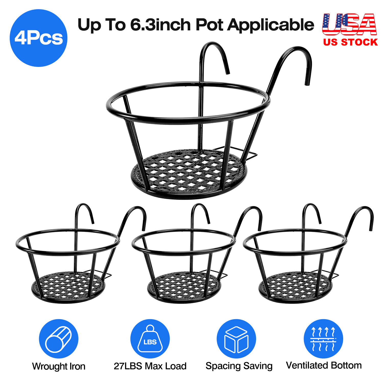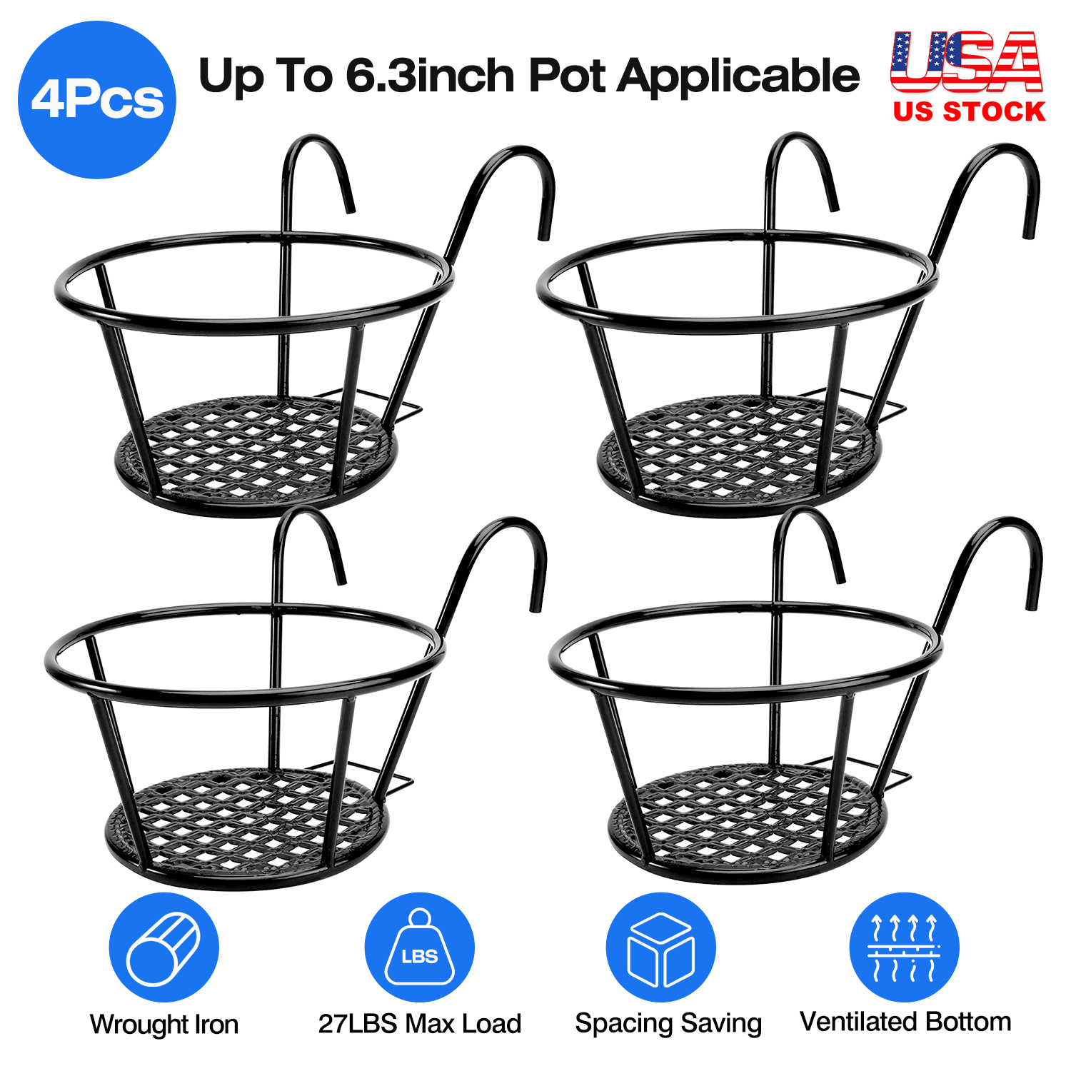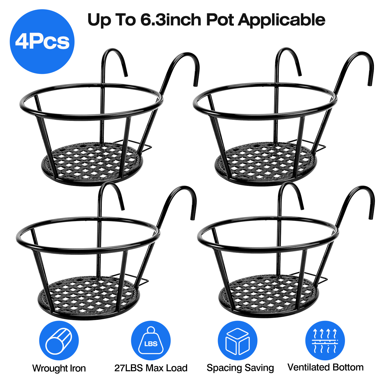 4Pcs Round Hanging Railing Planters Wrought Iron Flower Pot Holder Over The Rail Fence Plant Stand Basket 27LBS Load for Patio Balcony Porch Fence