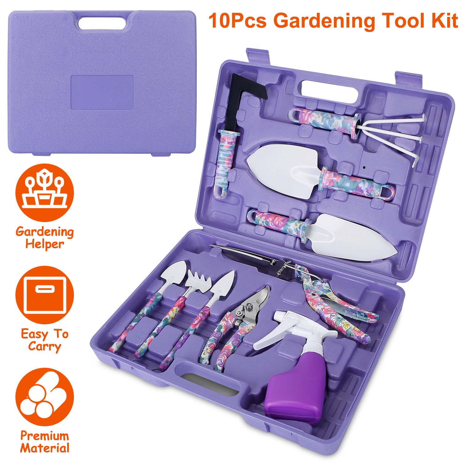 Home > 10Pcs Gardening Hand Tool Set Ergonomic Handle Gardening Work Kit w/ Rake Shears Shovel Spray Bottle Purple Floral Print Portable Carrying Case