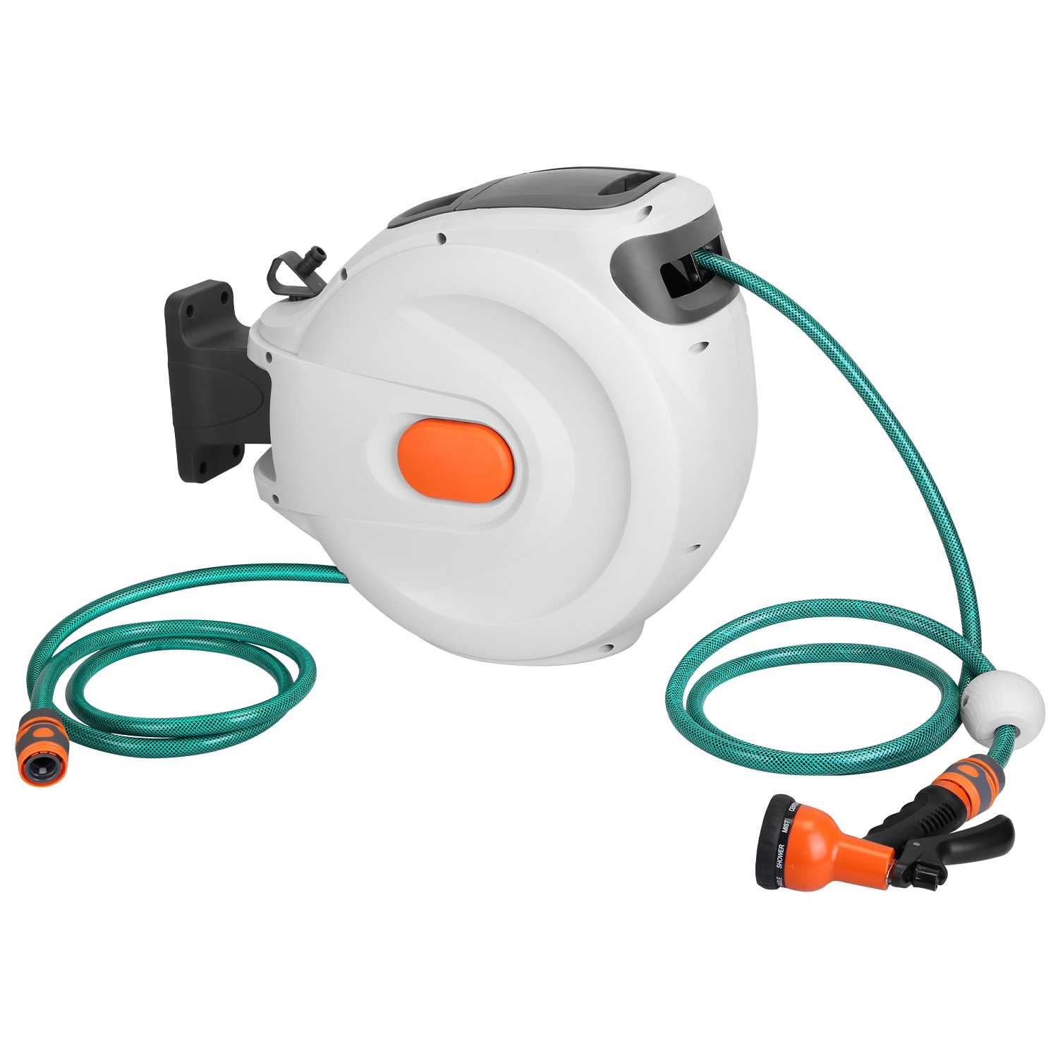Home > Retractable Garden Hose Reel Wall Mounted Automatic Water Hose Reel with Any Length Lock 8 Pattern Spraying Modes 180° Swivel Bracket